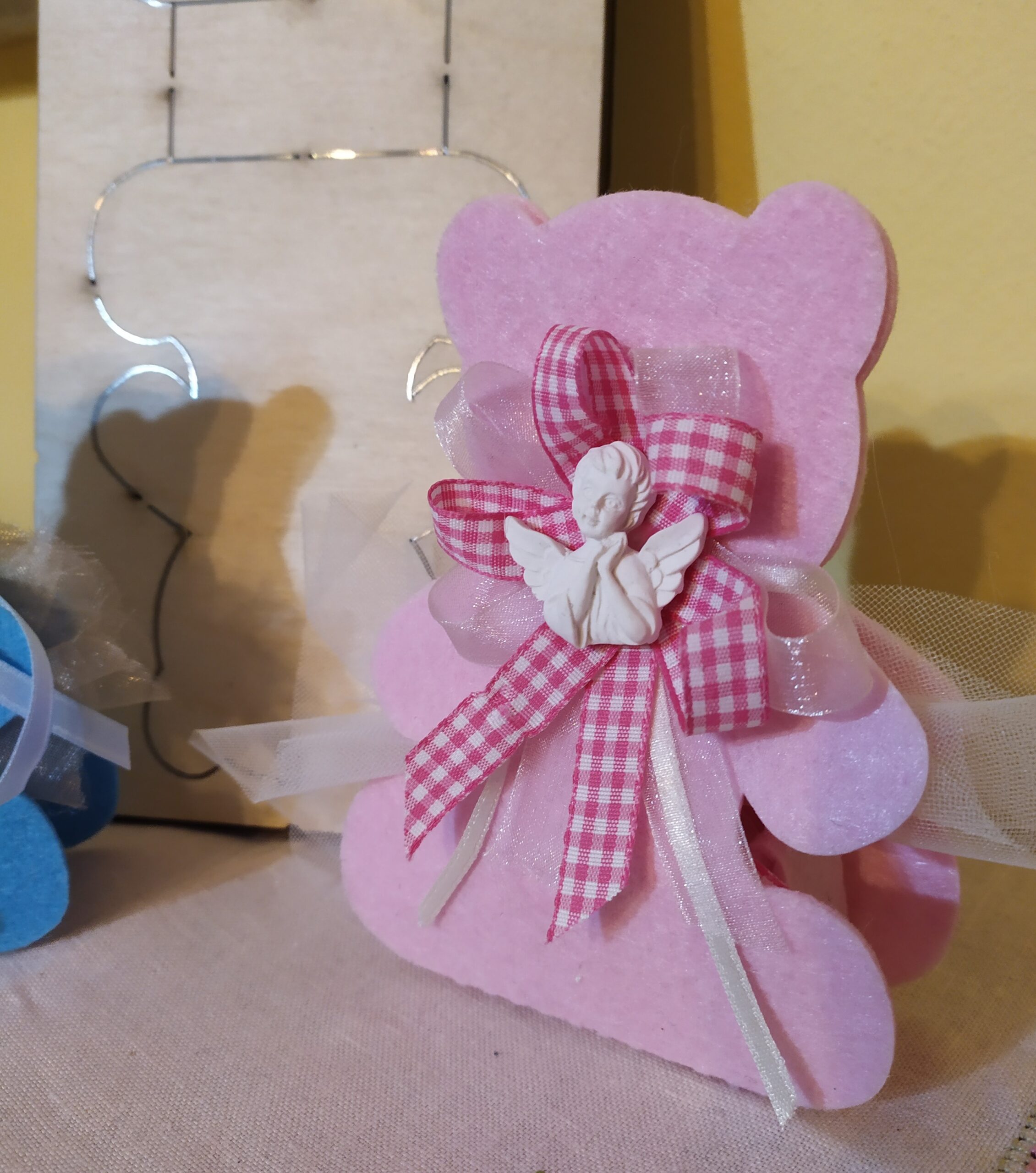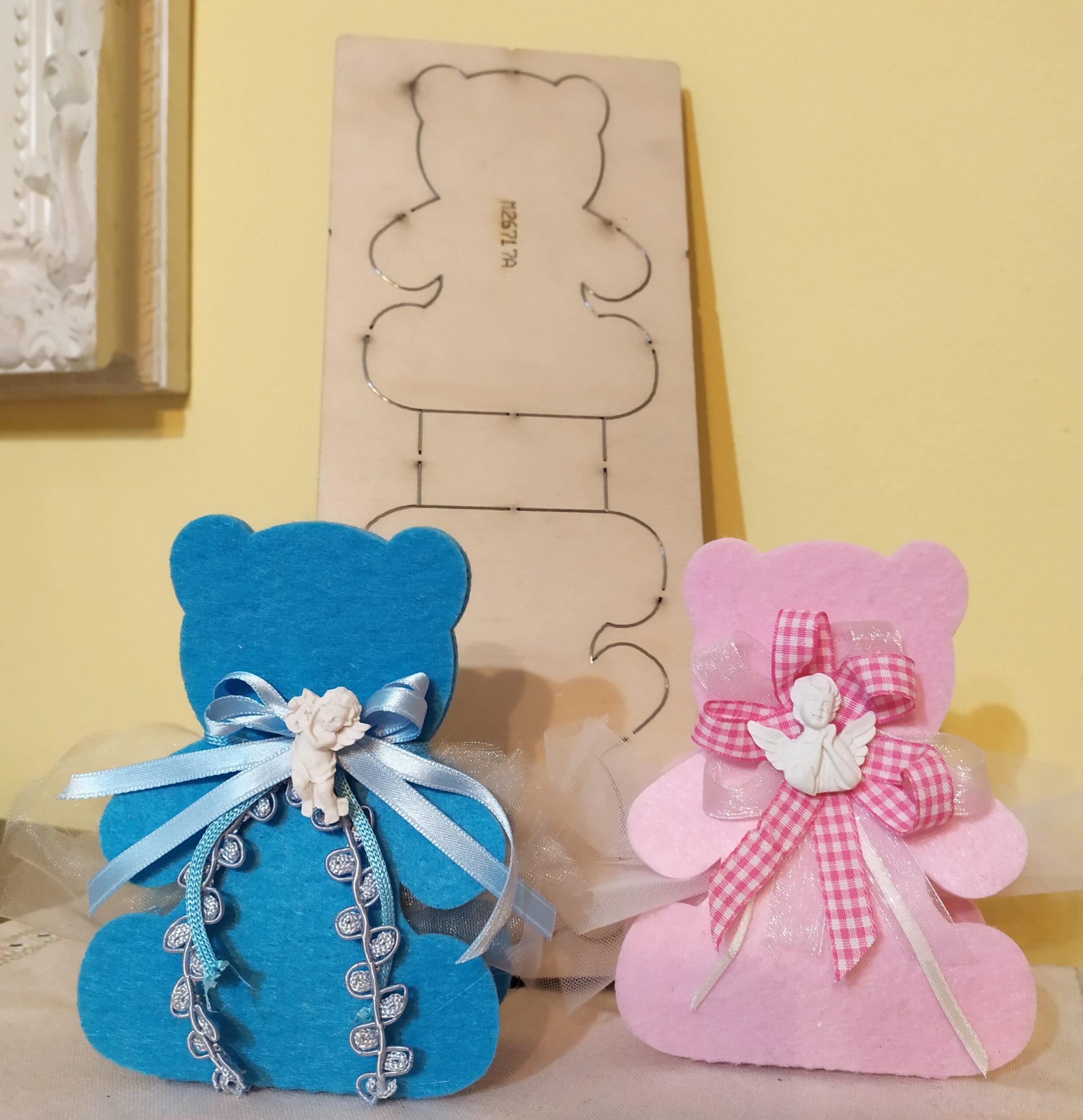Fustella per realizzare una bomboniera a sagoma di orso di circa 13×9,5 cm.