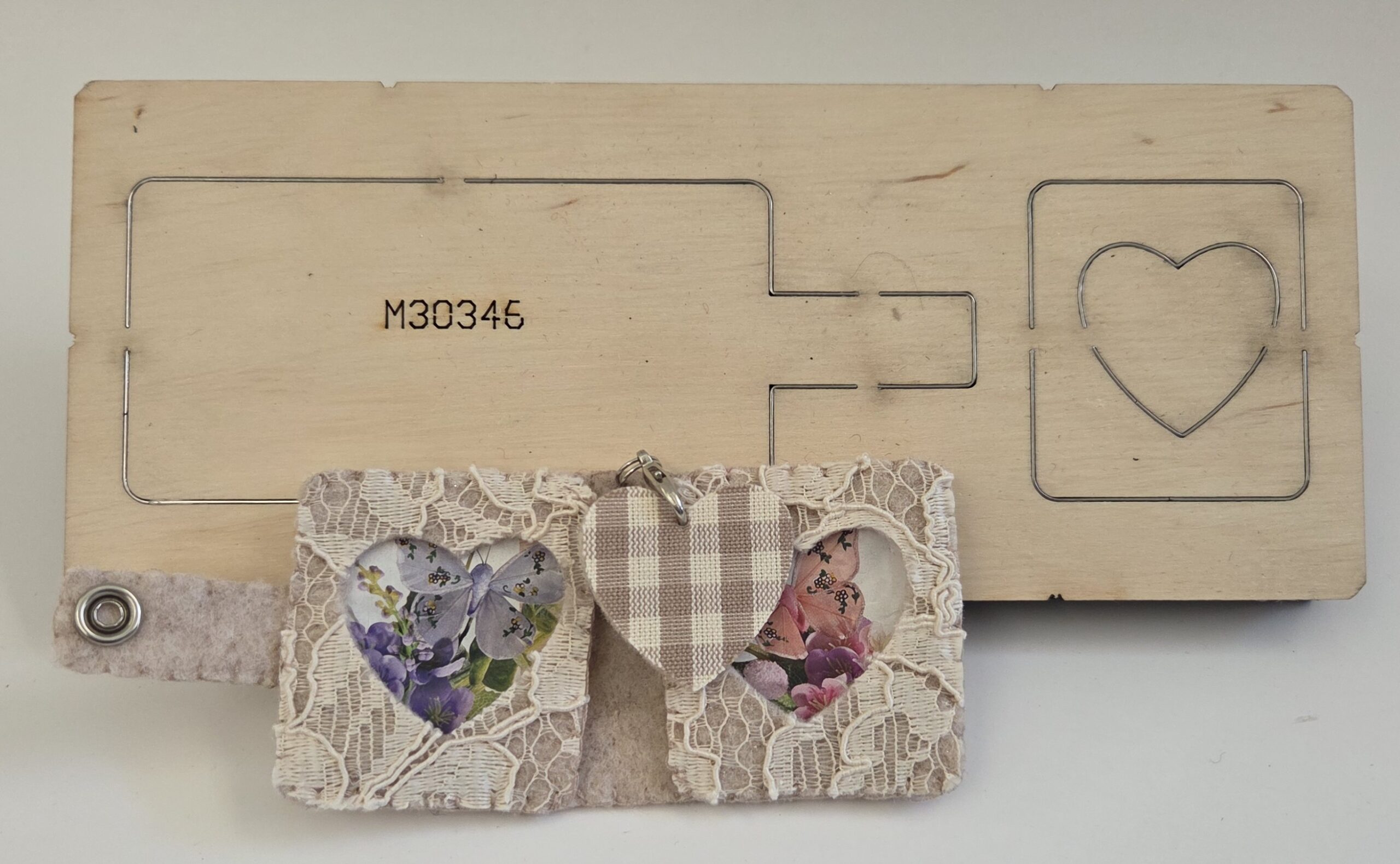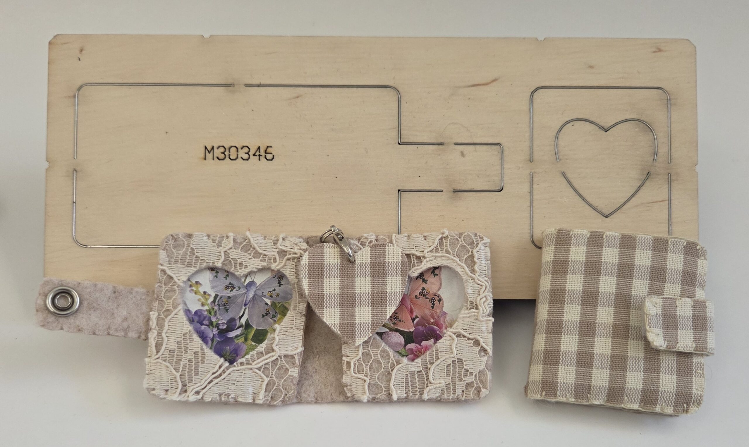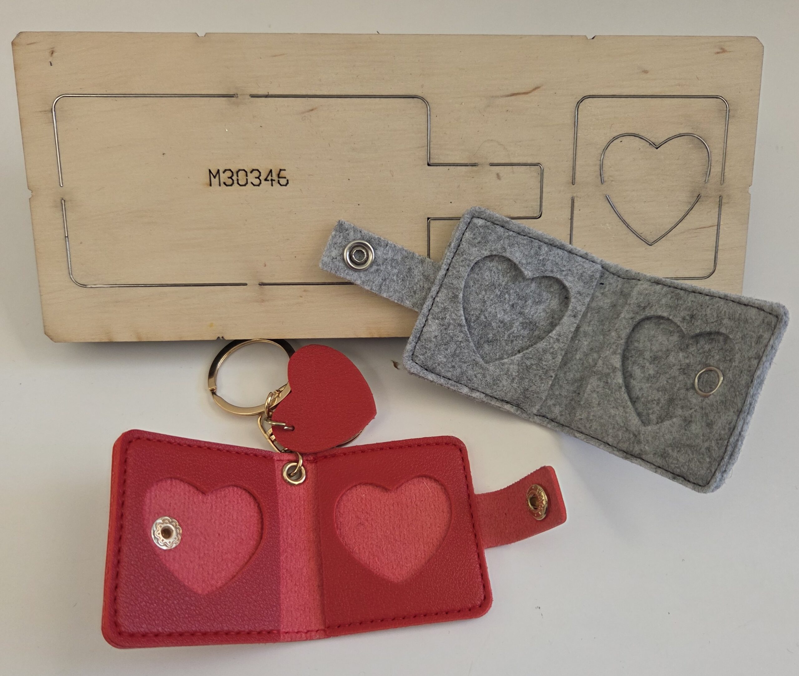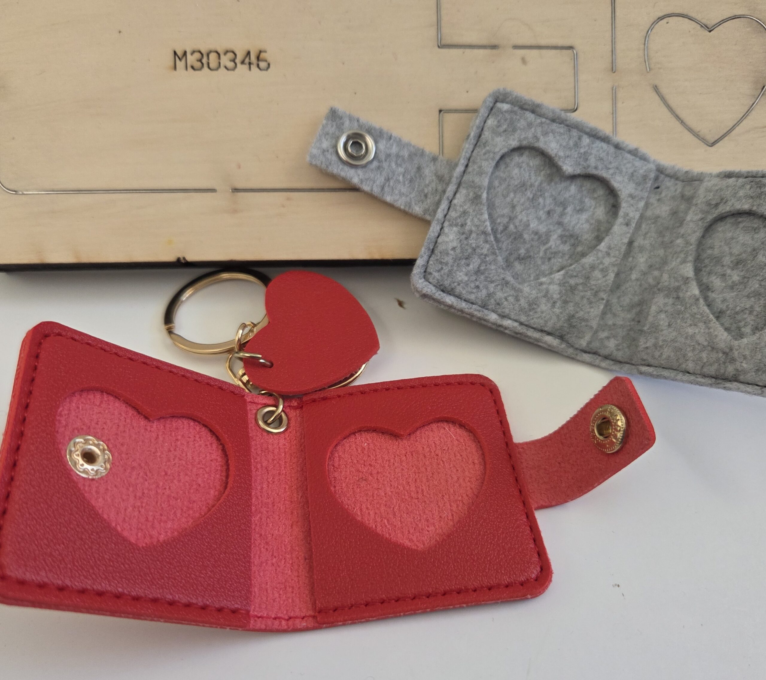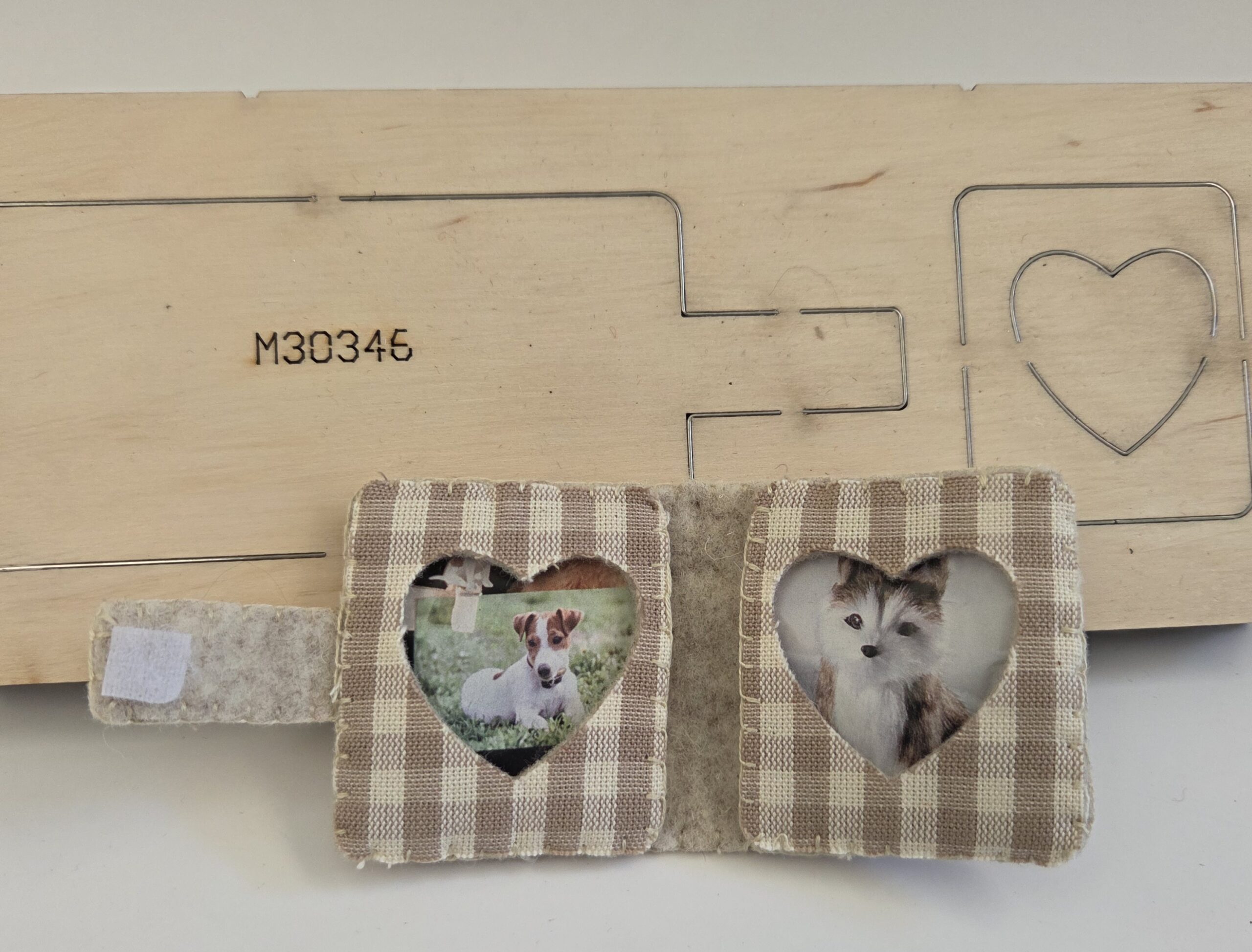 Fustella per realizzare un porta foto di 5,5×5,5 cm chiuso. Simpatico appendi borsa o porta chiavi, semplice da comporre sia incollato che cucito.