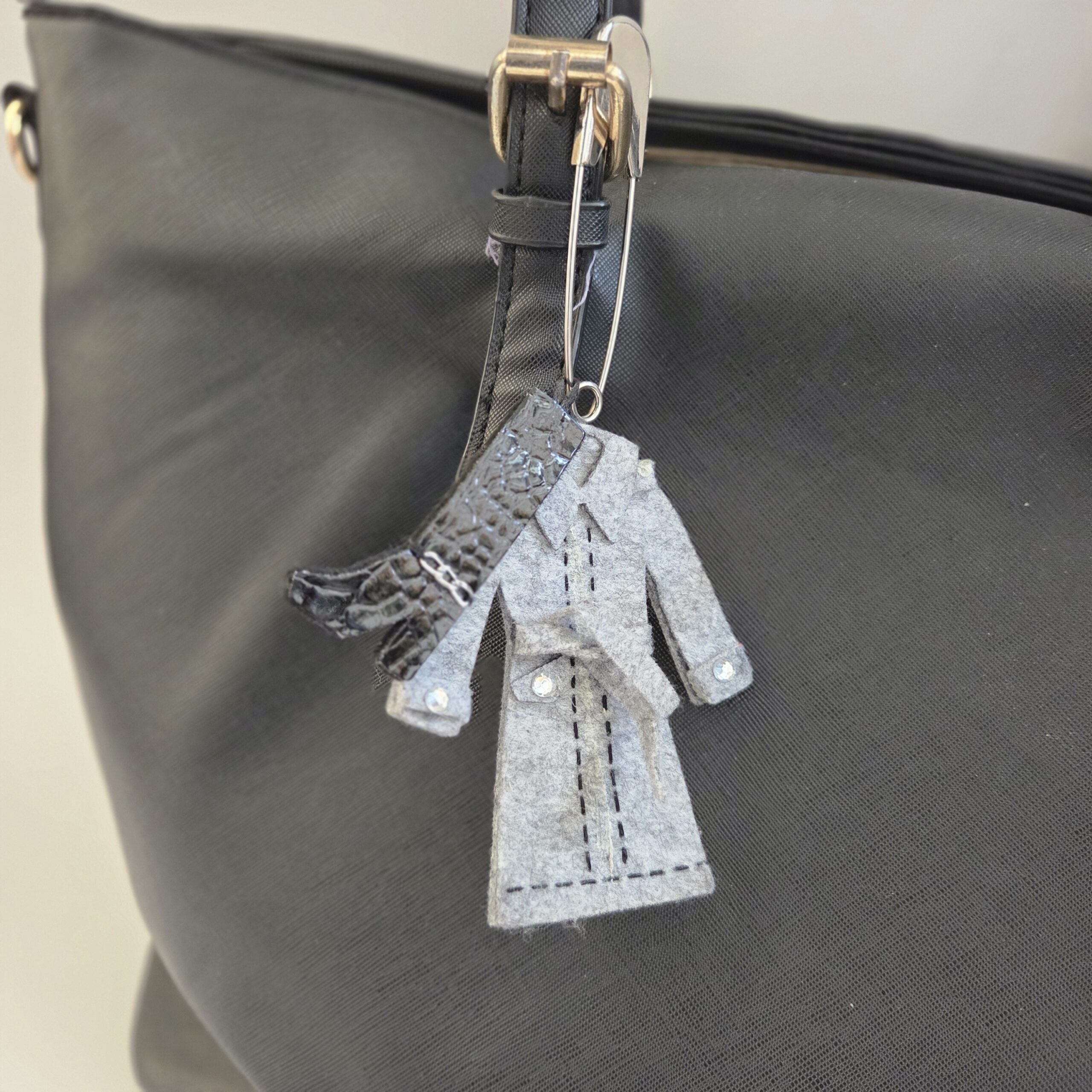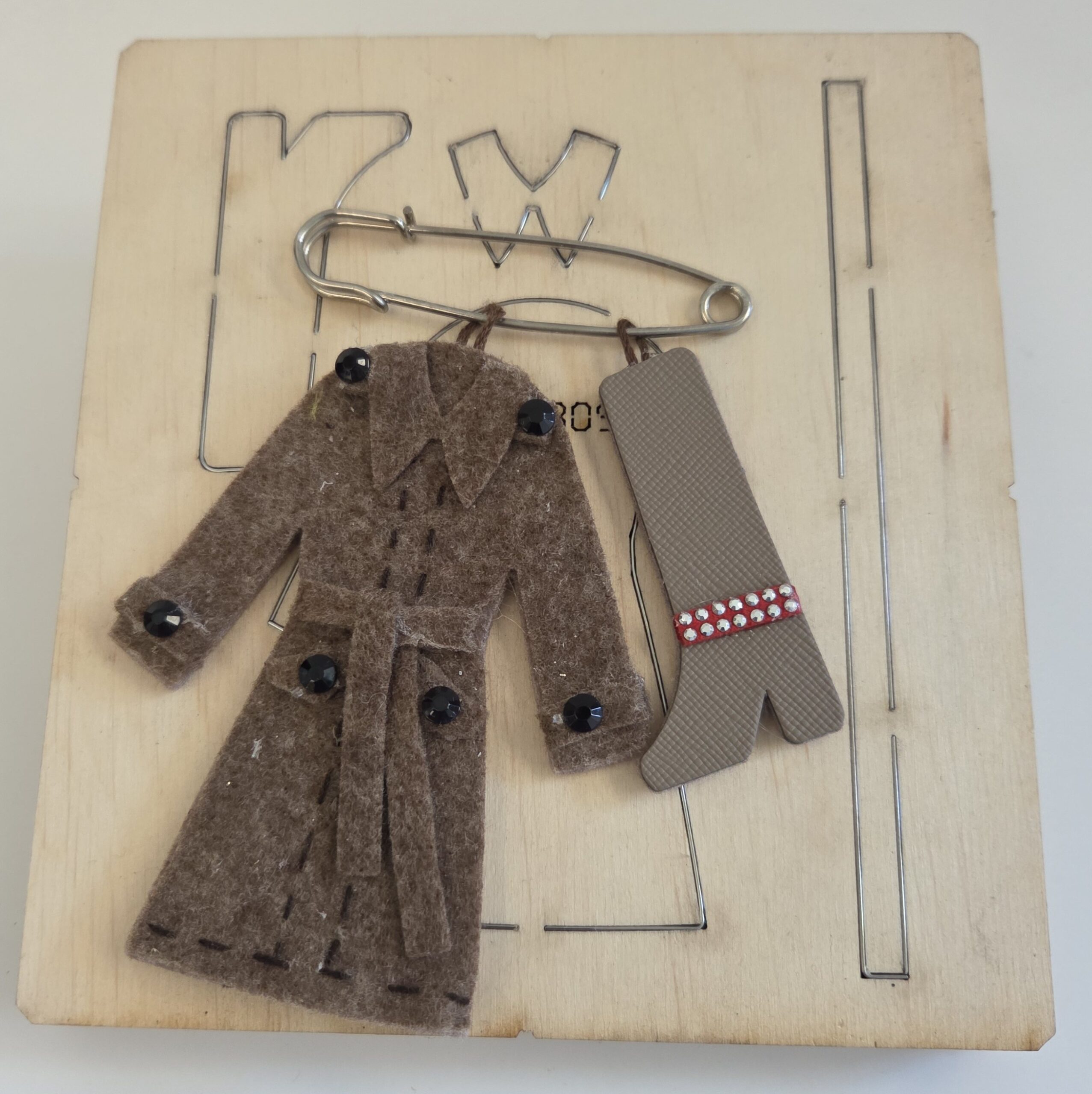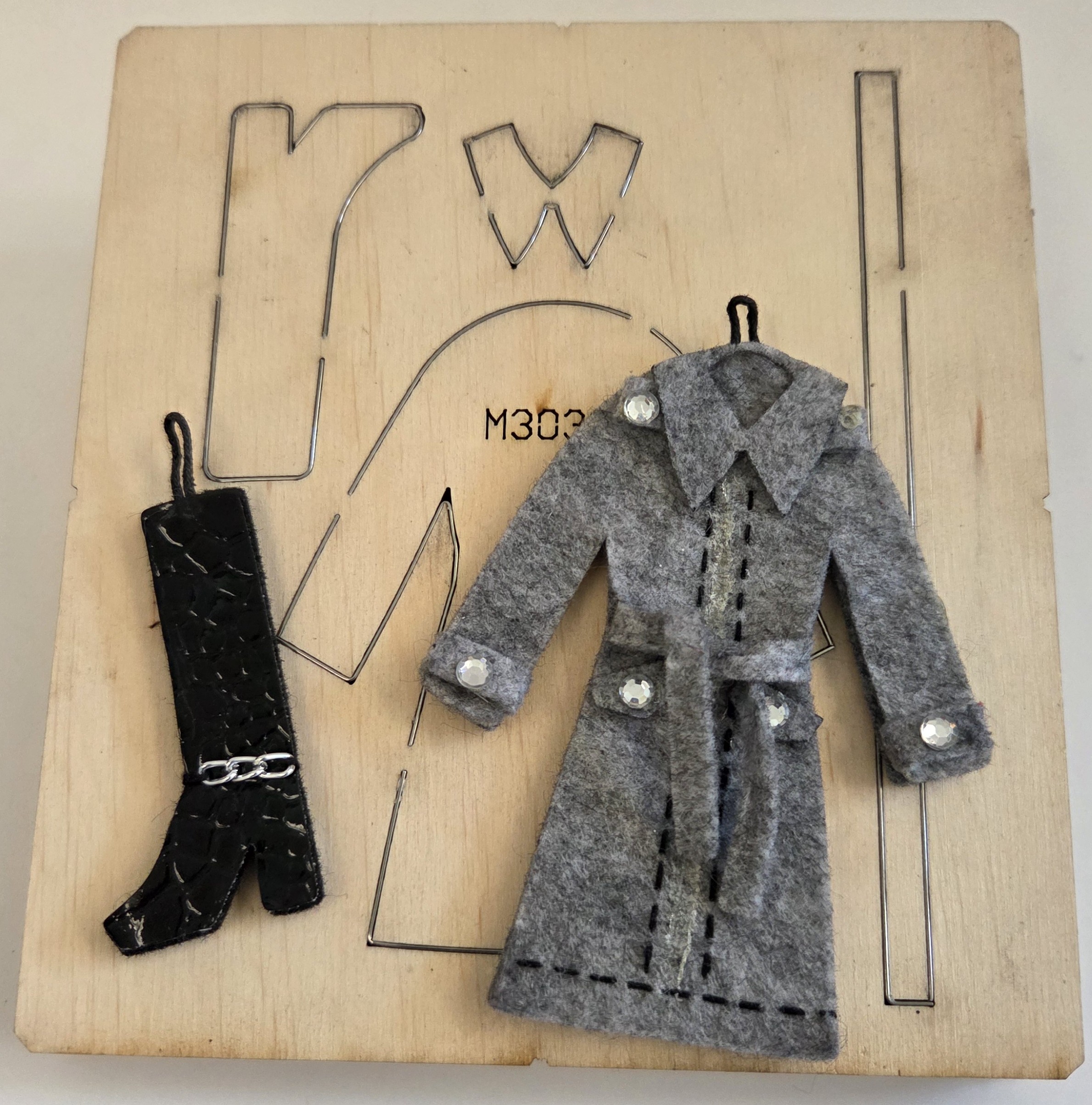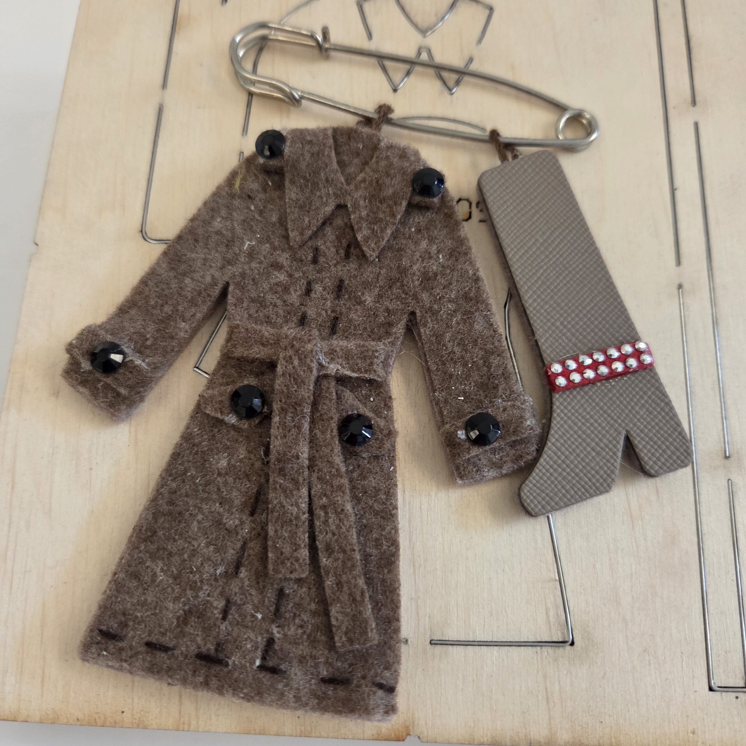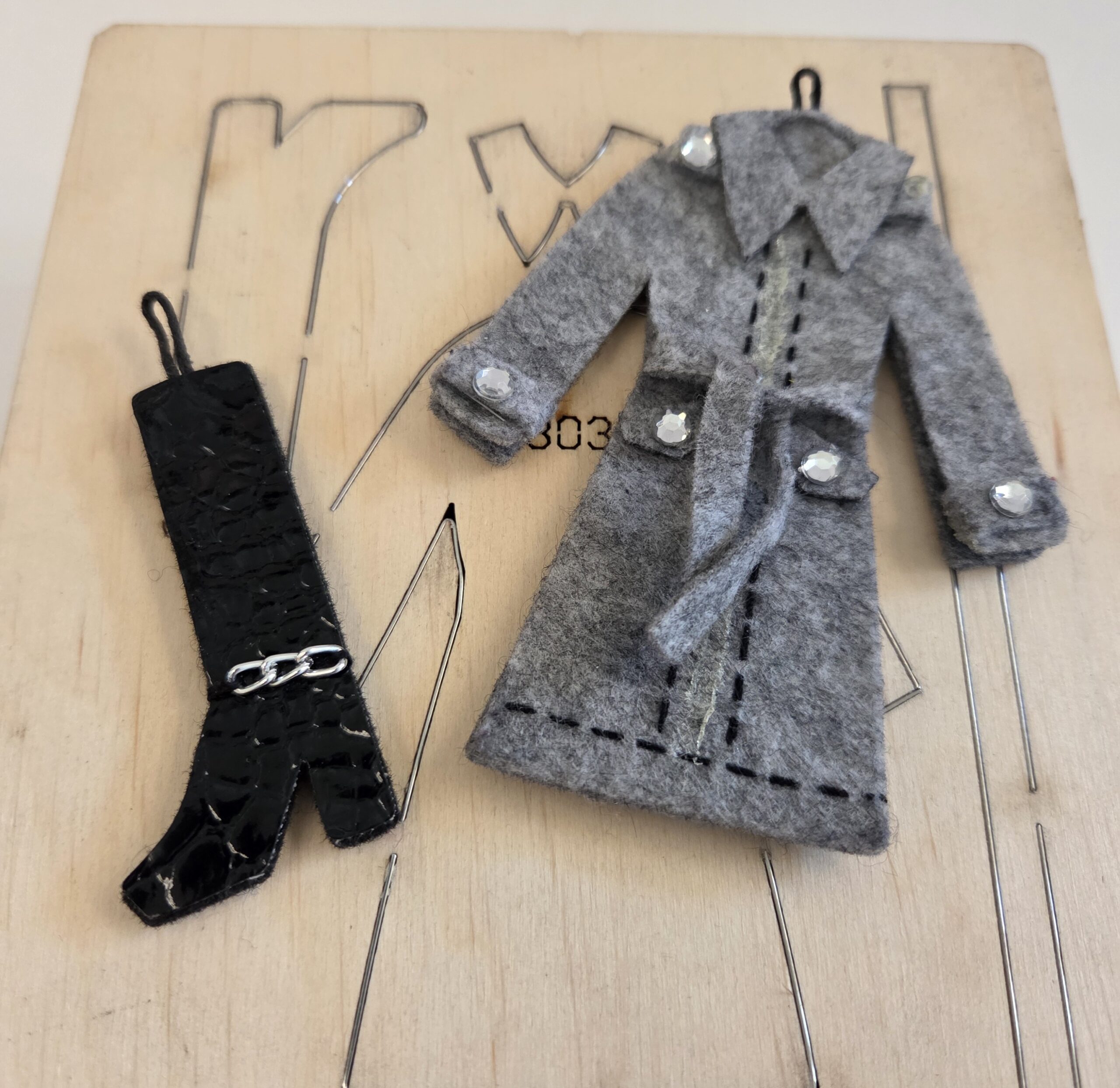 Fustella per realizzare un abito, cappotto con uno stivale come simpatico accessorio da attaccare alle borse o come portachiavi. Il vestito misura 10×8 cm e lo completa il colletto ed una cintura che lo trasforma in un cappotto, mentre lo stivale è di 6,5×3 cm. Possono essere utilizzati insieme o separati.